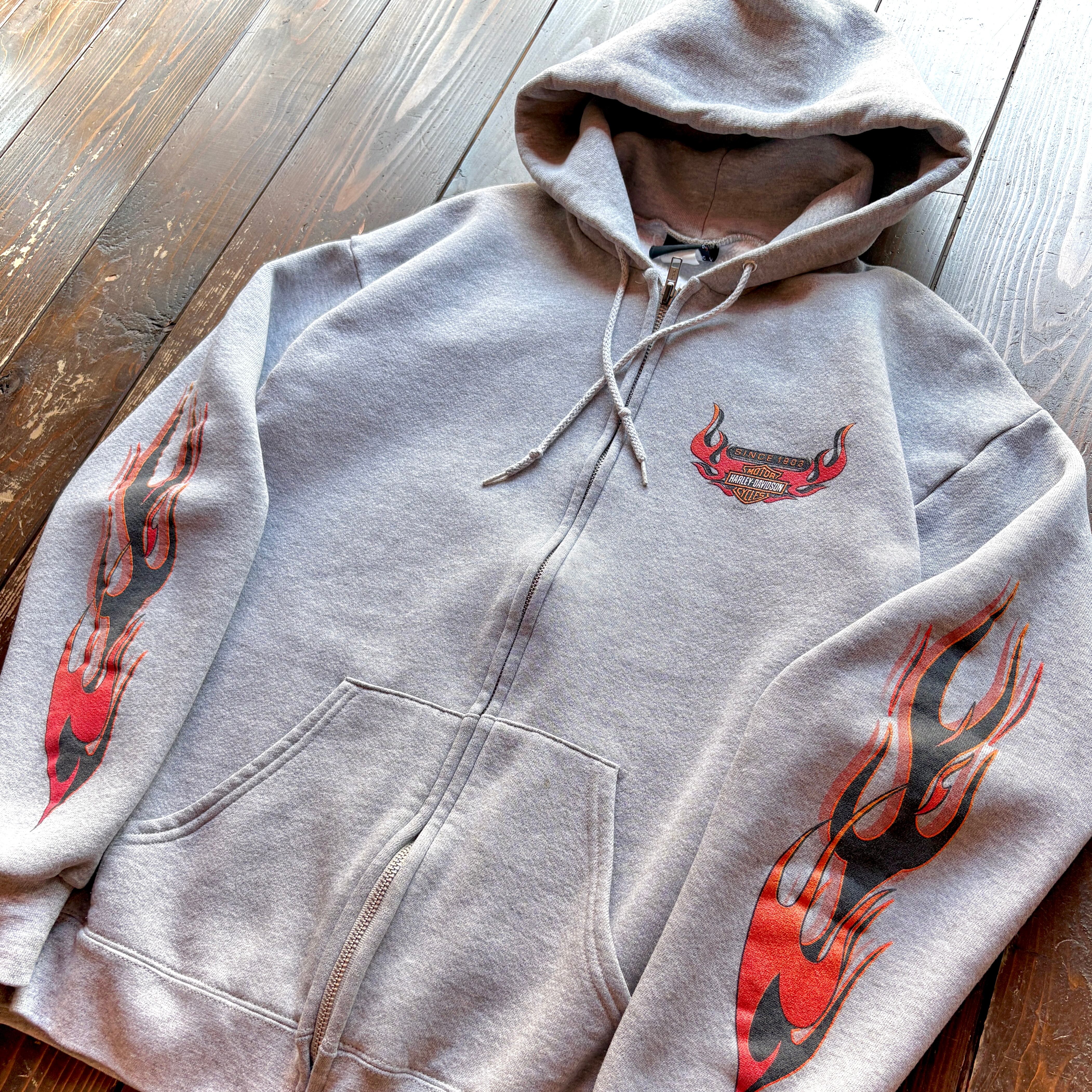 00's HARLEY - DAVIDSON 〝Albuquerque . N.M 〟Dealer Shop 4side Fire Pattern Print ZIP Sweat Hoodie / Size LARGE