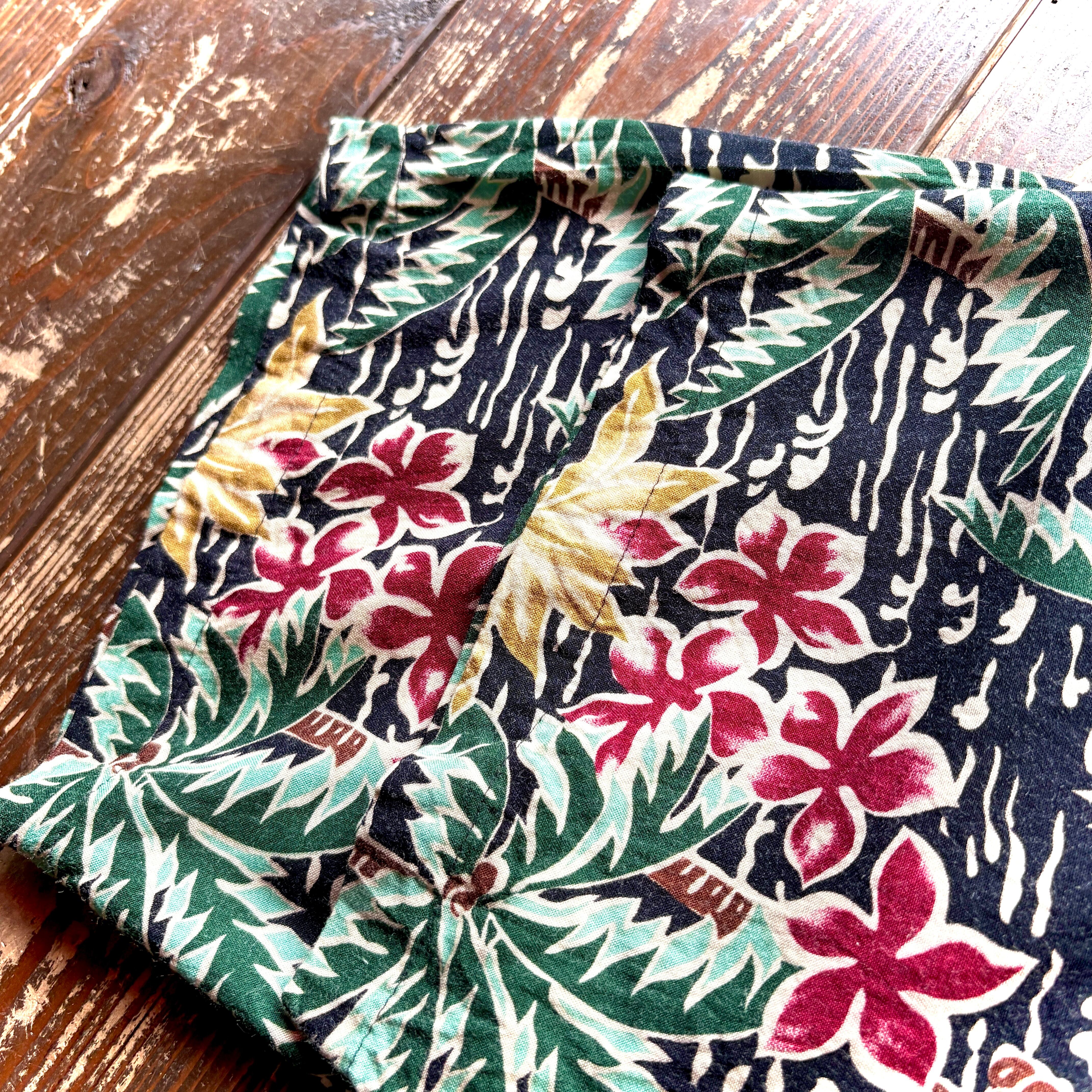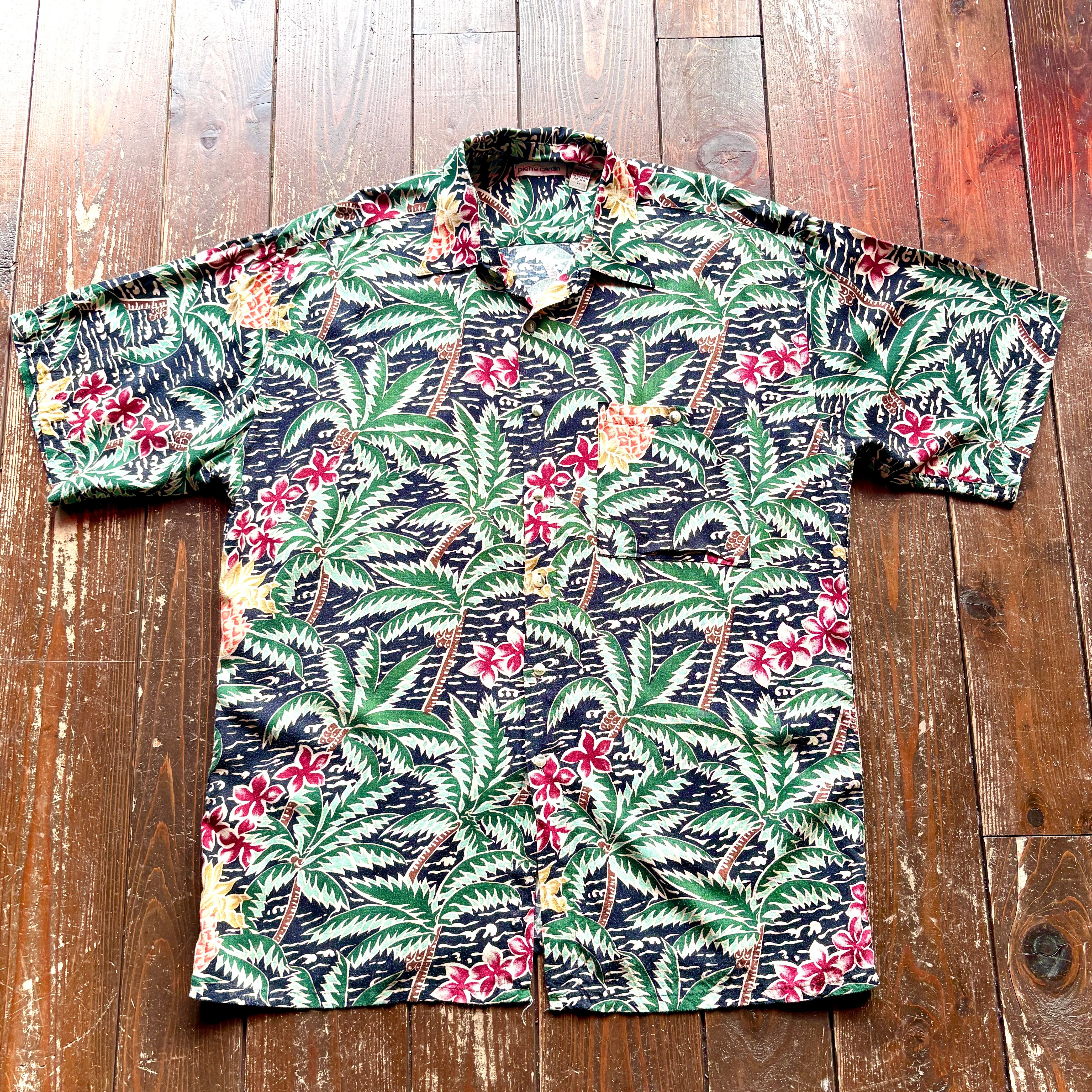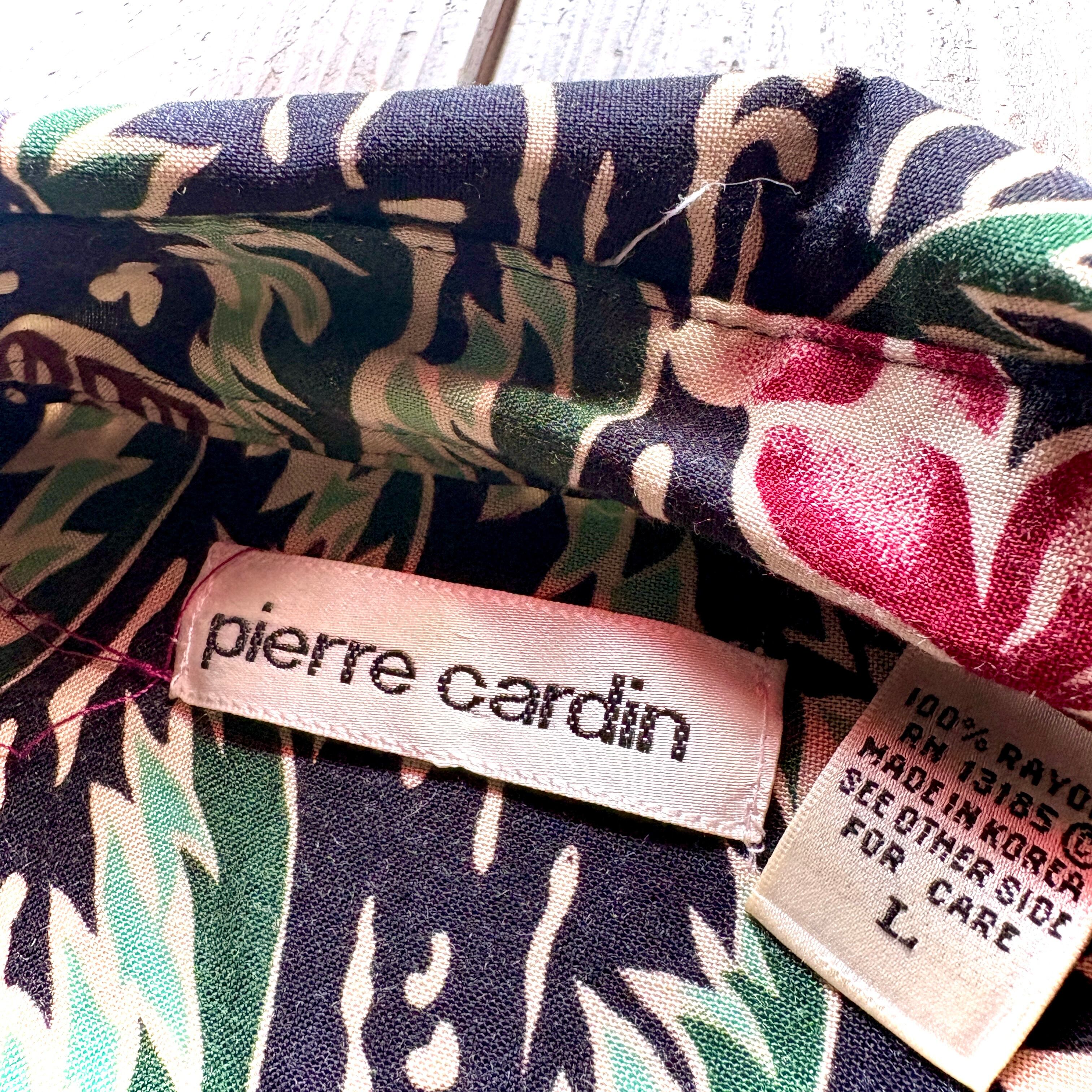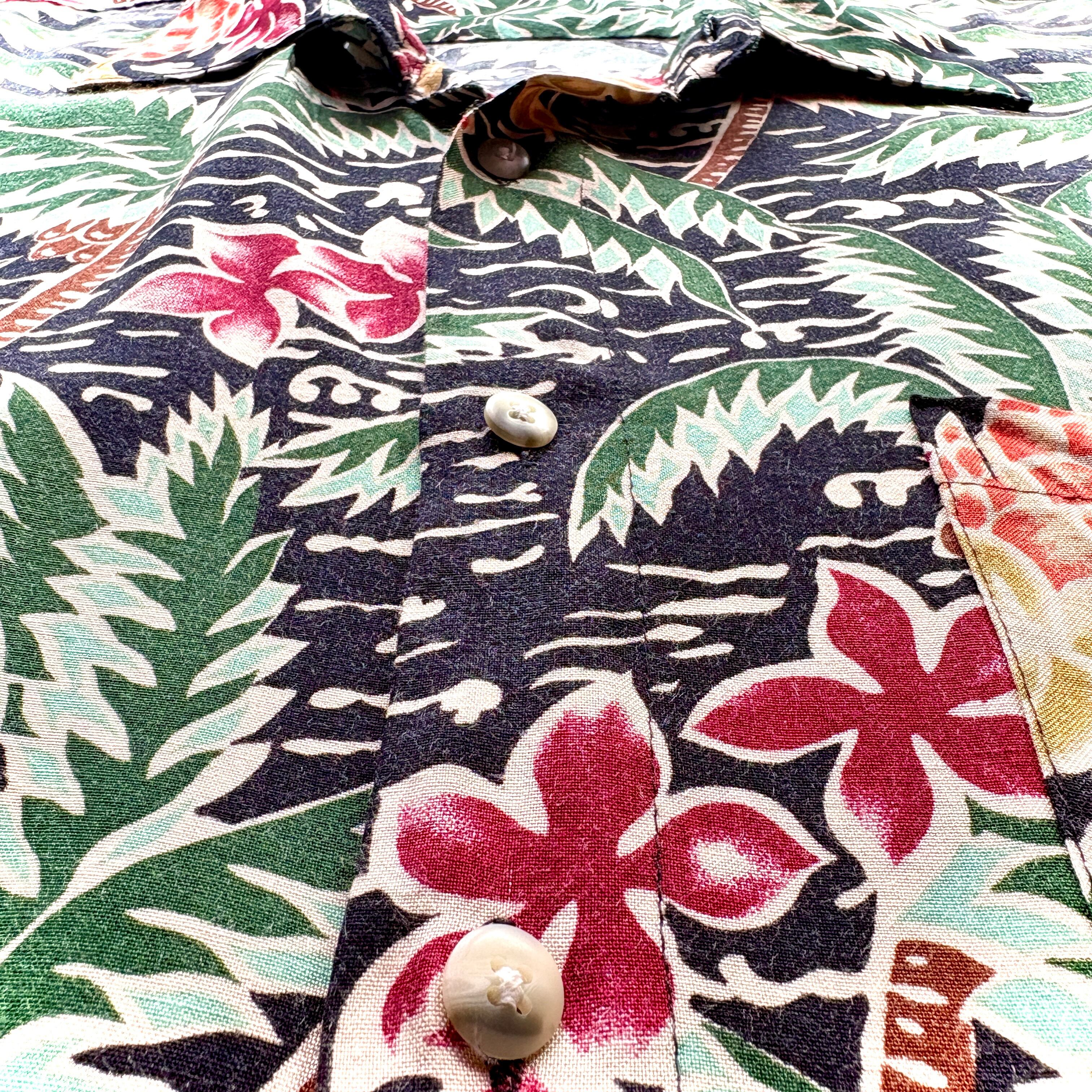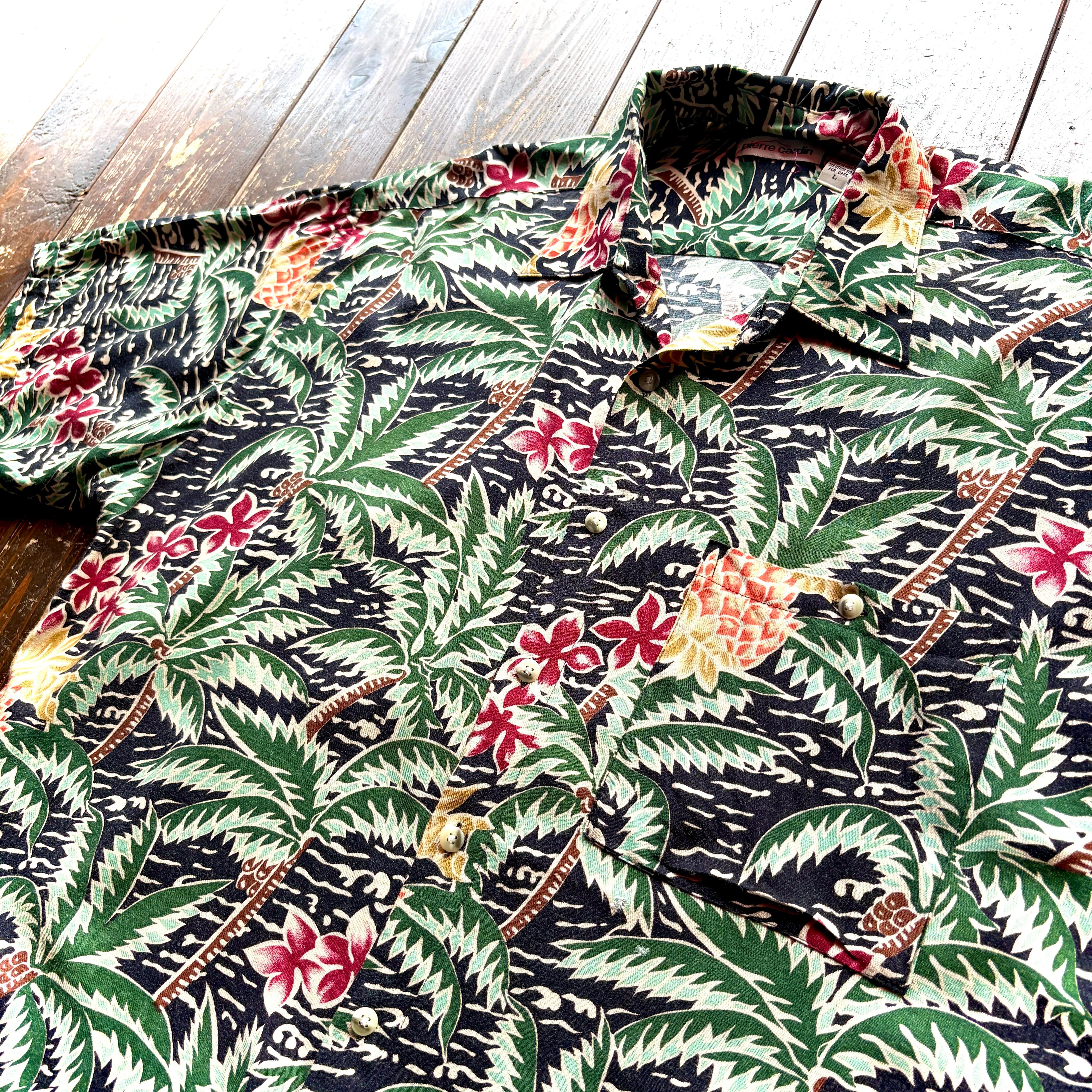 90's pierre cardin - BLACK - Flower Pattern 100% RAYON Aloha Shirt / Size LARGE