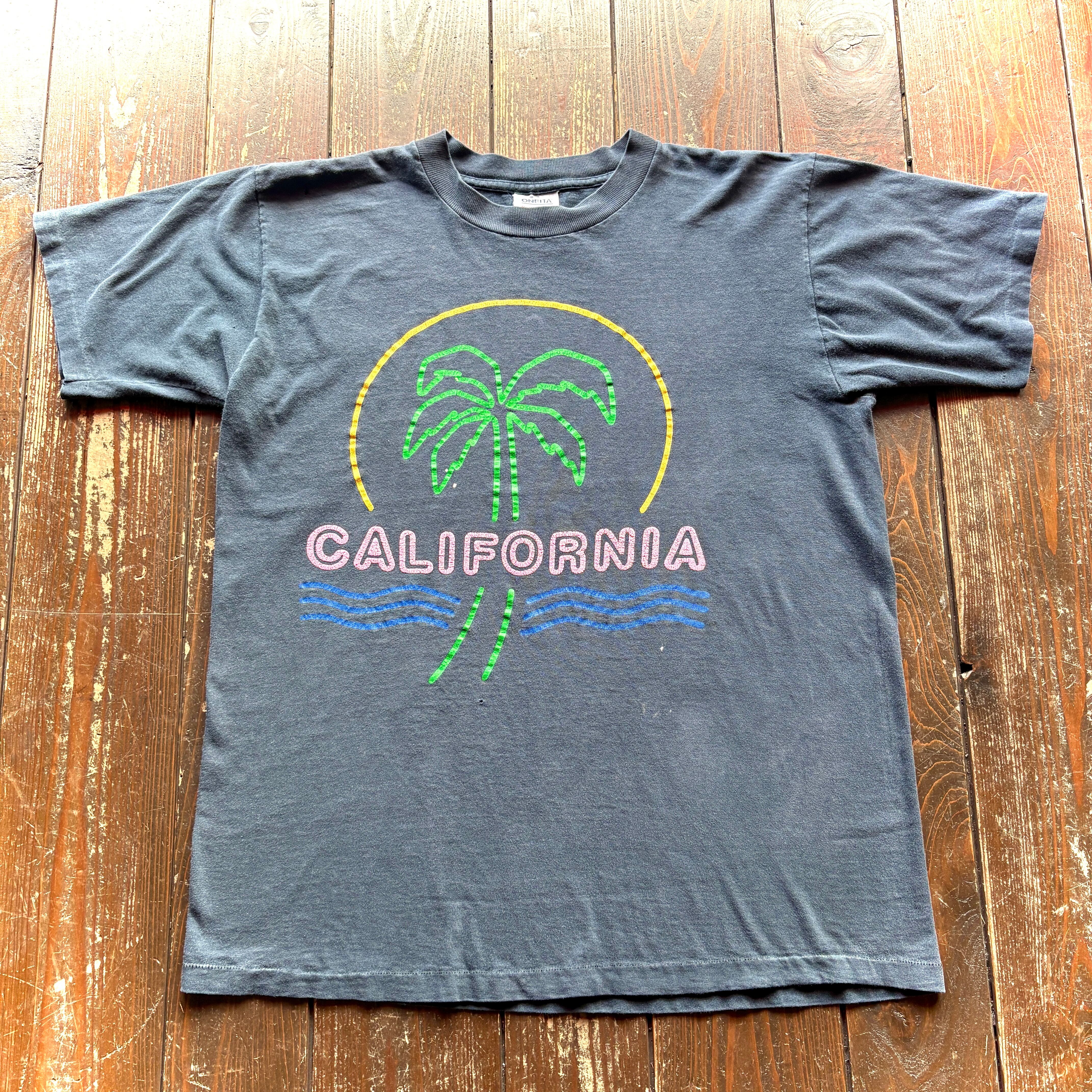 80's CALIFORNIA Neon Sign Pattern Souvenir T-Shirt Single Stitch Sleeve ONEITA Body Cotton 100% - MADE IN U.S.A - / Size X-LARGE